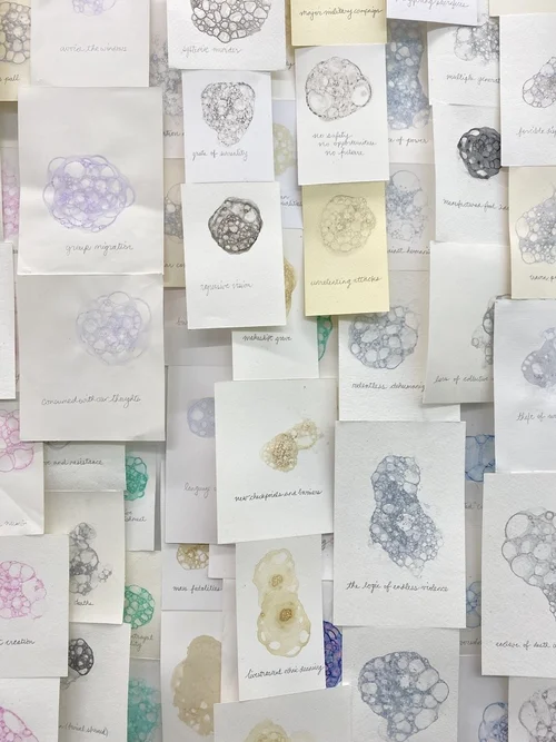 The drawings are small and produced on a range of surfaces. The bubble images developed as a way to consider cellular structure—those that produce life as well as those that destroy.